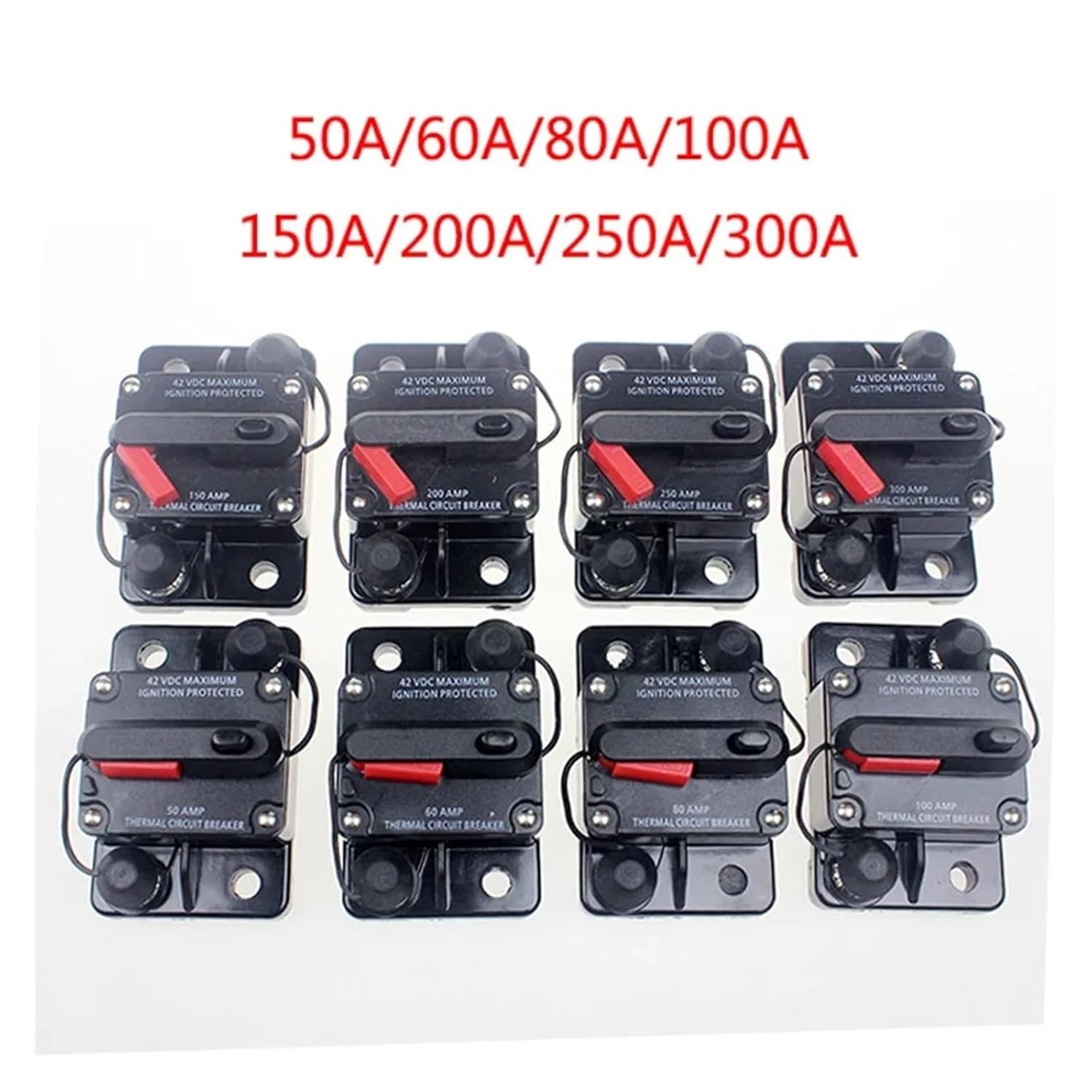 Waterproof Circuit Breaker 12V 24VDC 50A 60A 80A 100A 150A 200A 250A 300A AMP Car Auto switch Fuse Reset circuit breakerWe have50A 60A 80A 100A 150A 200A 250A 300AProduct features and specifications:High Current Circuit Breaker1. Product name: Overcurrent, overvoltage, overcharge automatic circuit breaker protector, stop power surge damage to the amplifier2. Mode of operation: electronic3. Input voltage: 12-42 VDC4. High current protection: 50A, 60A, 80A, 100A, 150A, 200A, 250A, 300A5. Breaking speed: normal breaking speed6. Installation: easy to install, can be installed on any flat panel or wall7. Product function: over current protection, over voltage protection, current residual protection, over charge protection8. Product size: 74x49x45mm (LxWxH)9. Stud: 1/4"-2810. Product color: black plastic11. With waterproof protective plastic cover12. Car audio/video overload protector13. Automatic detection, manual recoveryPackage included:1Pcs 12V-24V DC Home Solar Waterproof Circuit Breaker Reset Fuse InverterProduct ShowsType : MiniModel Number : Solar Circuit Breakeris_customized : YesIs Smart Device : No
